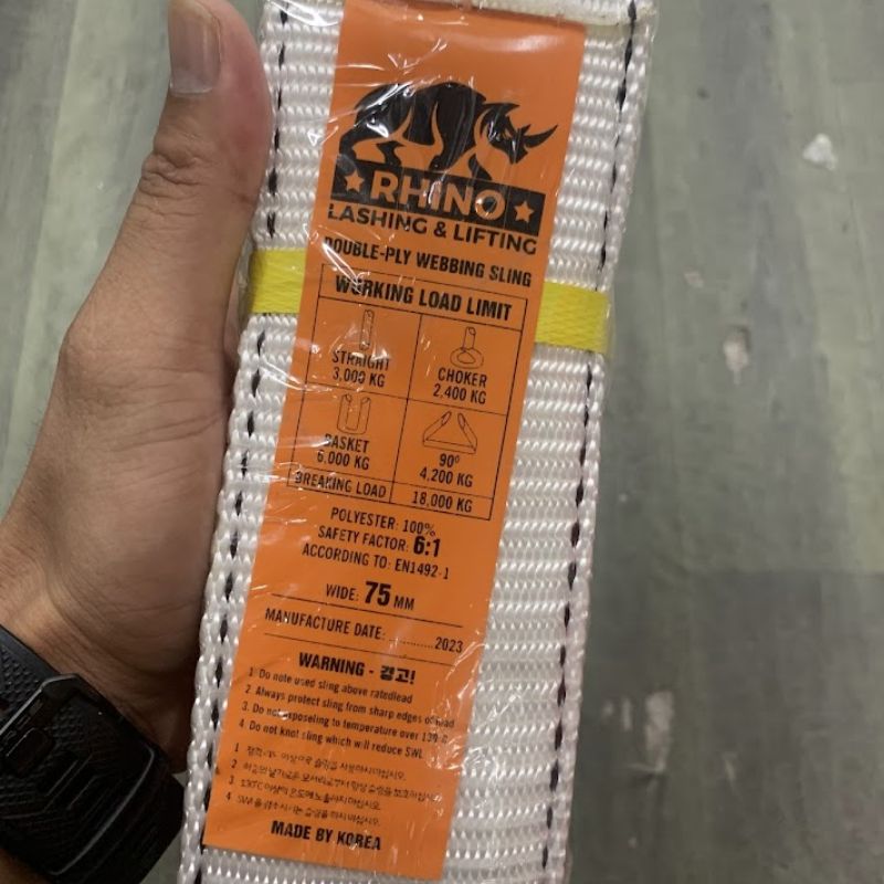 • Kích thước: Với chiều rộng 7.5cm, dây cẩu có diện tích tiếp xúc lớn, phân tán lực đều và giảm thiểu khả năng bị mài mòn.